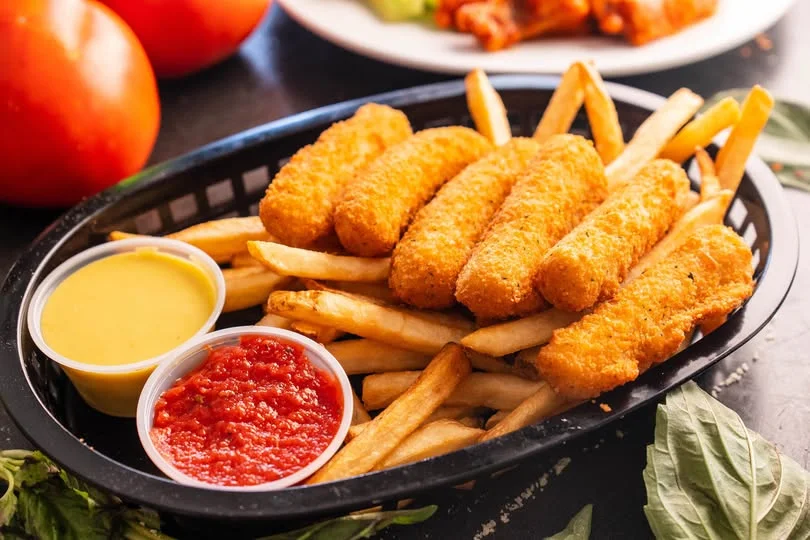 Three gooey mozzarella sticks served with golden fries and a dip.